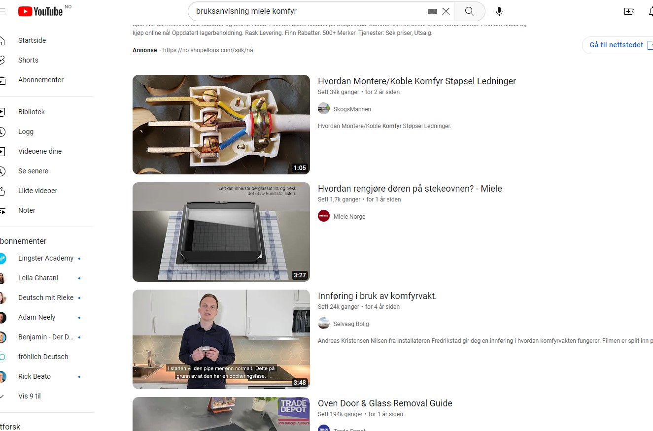 Et annet eksempel. Vi søker på «Bruksanvisning Miele komfyr»: