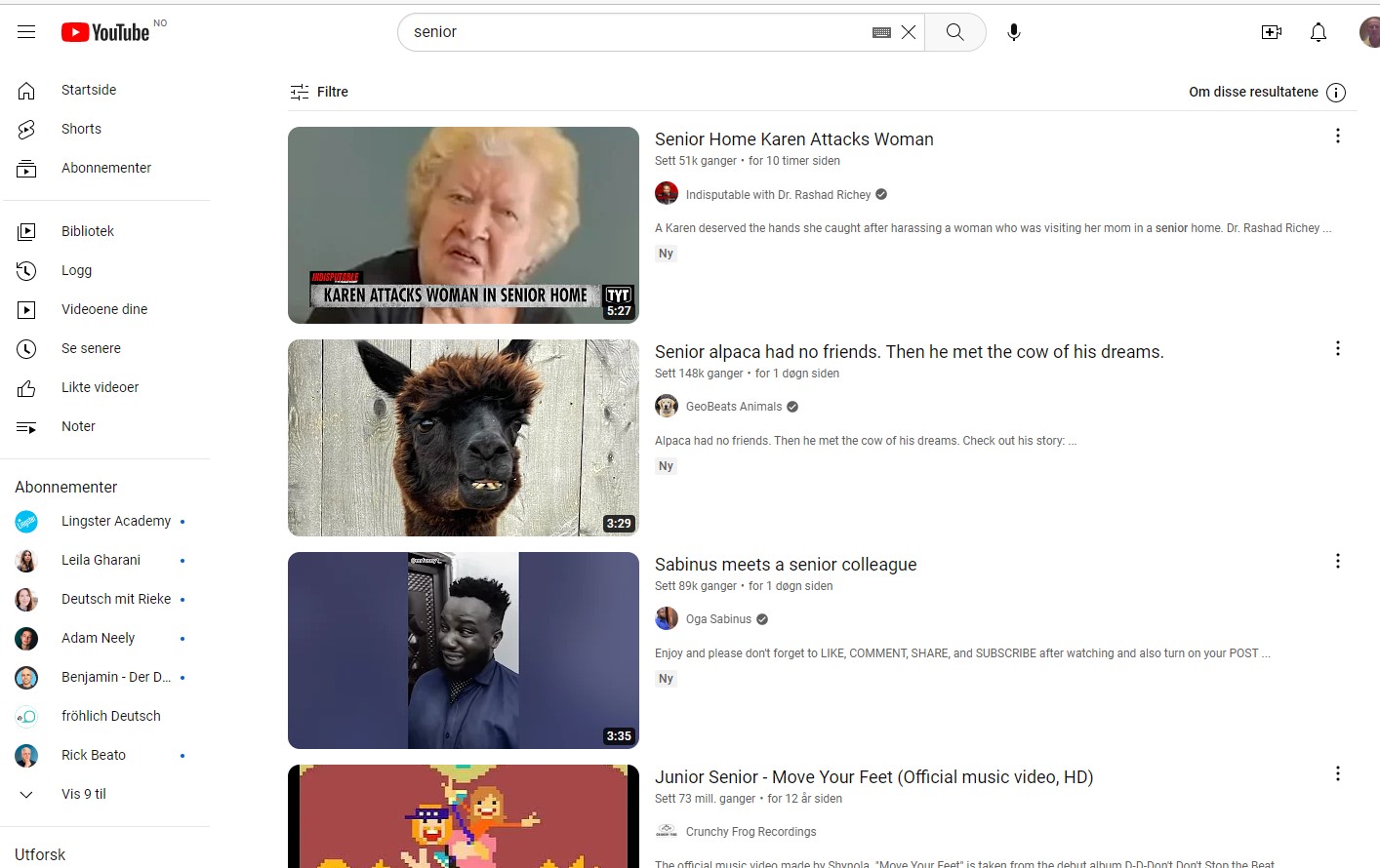 I venstre marg kan du se din logg (altså de videoene du sist har sett på). Og du kan se «abonnementer». Man kan abonnere på såkalte kanaler, slik at du enkelt får opp videoer som hører sammen.