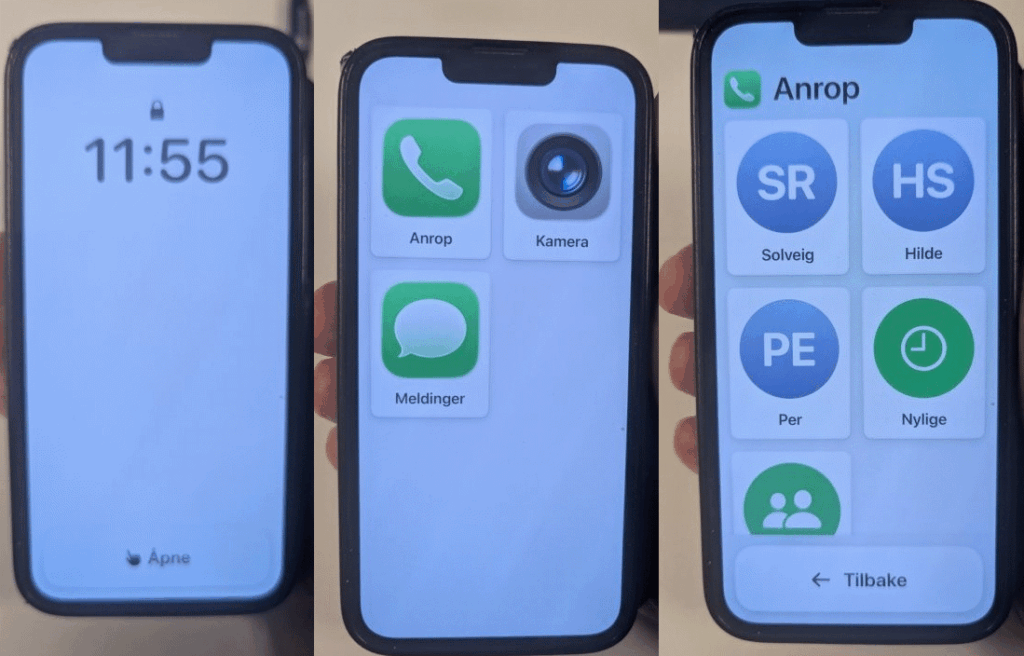 Vi beklager at bildene ble litt dårligere av hvordan skjermene ser ut når alle valg er gjort og assistert tilgang er aktivert. Det skyldes at assistert tilgang ikke støtter at man tar skjermdump, vi måtte derfor avfotografere skjermen for å vise hvordan assistert tilgang ser ut. Første bilde viser låse-skjermen, kun klokke og åpne-knapp. Den neste viser hvilke apper som er gjort tilgjengelige og her ser du at knappene (ikonene) er store og tydelige. Tilslutt ser du hvordan «telefon» appen ser ut. Der ligger favoritter med navn, knapp til nylige og knapp til kontakter. Dette gjør bruk av telefonen veldig tydelig og du blir mindre forvirret av alle knappene som nå ikke vises. Du kan selvsagt legge inn mange flere apper(ikoner) enn de du ser her. Dette er bare et eksempel på hvordan det ser ut med noen få apper tilgjengelig.