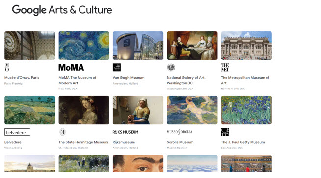 Google Arts & Culture er et prosjekt som er et unikt samarbeid mellom Google og mange anerkjente kunstinstitusjoner, og som lar folk oppdage og se en online samling av bilder av kunstverk fra museer rundt om i verden. Du kan også få en «virtuell spasertur» gjennom et museum etter ønske. Dette fungerer på samme måte som Google Street View. Totalt er titusenvis av verk online, og den virtuelle døren til tusenvis av museer er åpen.
