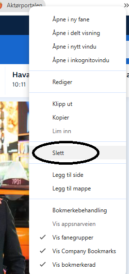 Du kan slette et bokmerke ved å høyreklikke på ikonet i bokmerkeraden og velge «Slett»
