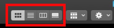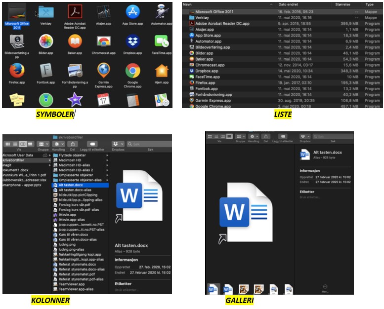 Det er fire forskjellige visninger som lar deg navigere i Finder: ‘Symboler’, ‘Liste’, ‘Kolonner’ og ‘Galleri’. Du finner disse alternativene helt øverst.