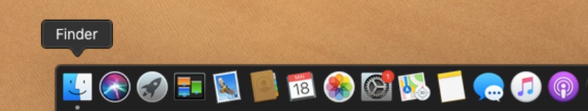 Finder-ikonet er det smilende ansiktet som du finner nederst til venstre på skjermen, på den såkalte Dock-linjen (Dock). Dock vises nederst på skjermen en del ikoner ved siden av hverandre. Du kan åpne programmer som du finner der, med et klikk direkte fra Dock.