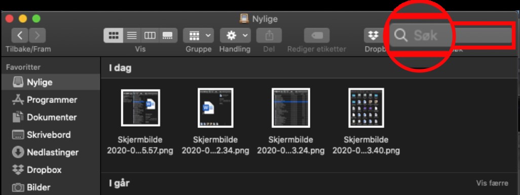 Søk-funksjonen finner du øverst til venstre i Finder vinduet.
