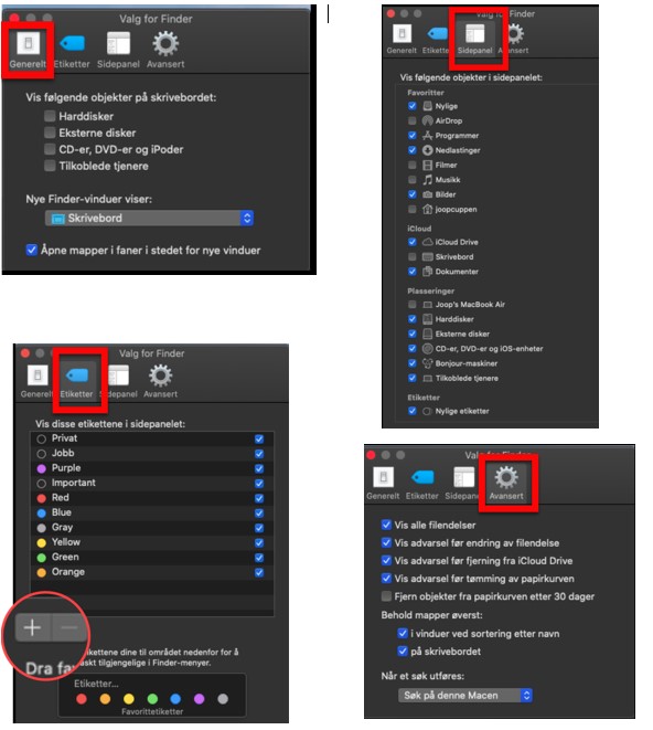 Etikketter: her kan du huke av eller ta vekk for de etiketter som skal vises i Finder. Du kan selv legge til etiketter ved å trykke på +. Da kan du gi denne etiketten er navn, for eksempel Privat eller Jobb.