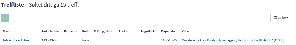 Når jeg da klikker på «søk» får jeg de treffene som er relevant etter de valgene jeg gjorde. I mitt tilfelle får jeg opp 15 treff. Og treff nr 1 er da min farfar. Her er første gang jeg finner ut hva AH står for. Andreas Hilmar.