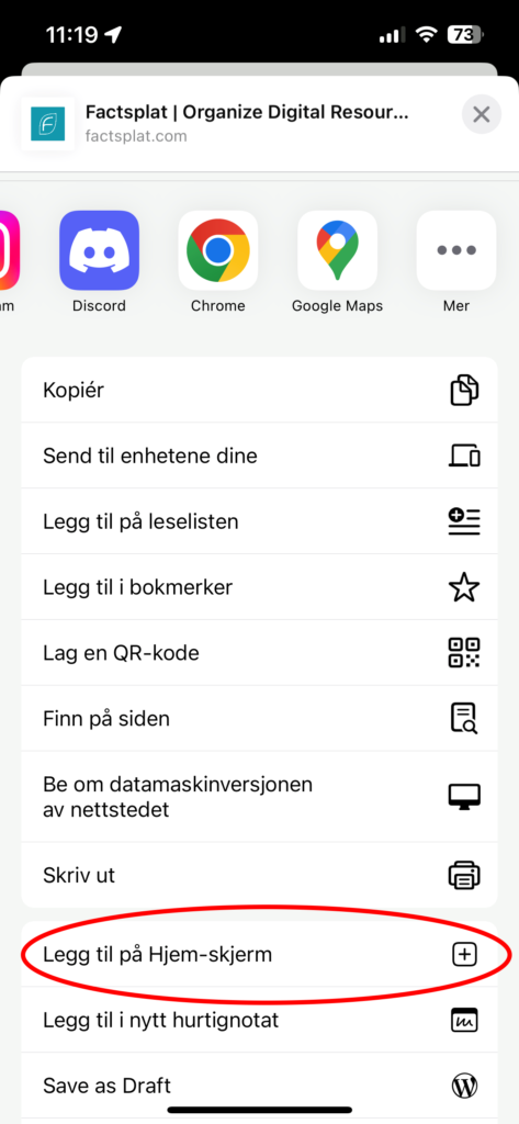 På Apple-produktene bruker du delingsknappen ,  og i menyvalgene som dukker opp trykker du på «Legg til på hjem skjerm». Da får du et Factsplat-ikon på første ledige plass på hjemskjermen din. Hvis du trykker på det ikonet, åpner du Factsplat direkte. Det blir akkurat som om du åpner en app.