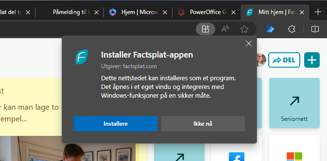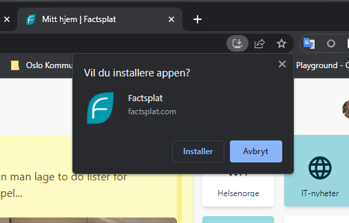 Når du trykker på ikonet i rød sirkel over, dukker det opp to valg, da skal du klikke på «Installer» og du får Factsplat festet nede på oppgavelinjen. Neste gang du skal åpne Factsplat, trykker du på ikonet på oppgavelinjen.