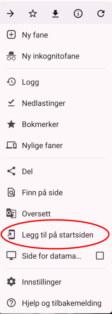 På androidtelefoner går du til factsplat.com i nettleseren din. Trykk på tre prikker øverst til høyre og velg «Legg til på startsiden» slik du ser i bildet under. Da vil du få et nytt ikon på startsiden din, som tar deg direkte til Factsplat.