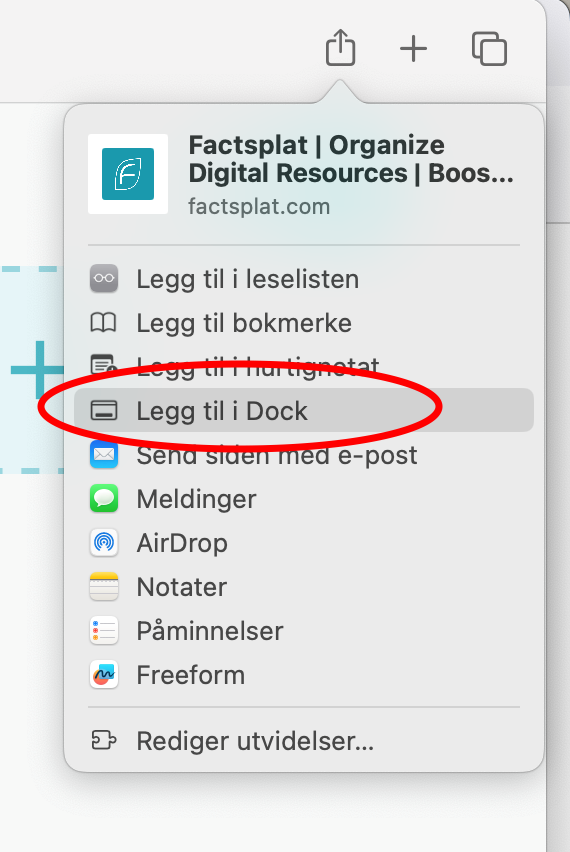 I Safari åpner du factsplat.com. På menylinjen velger du Fil > Legg til i Dock.