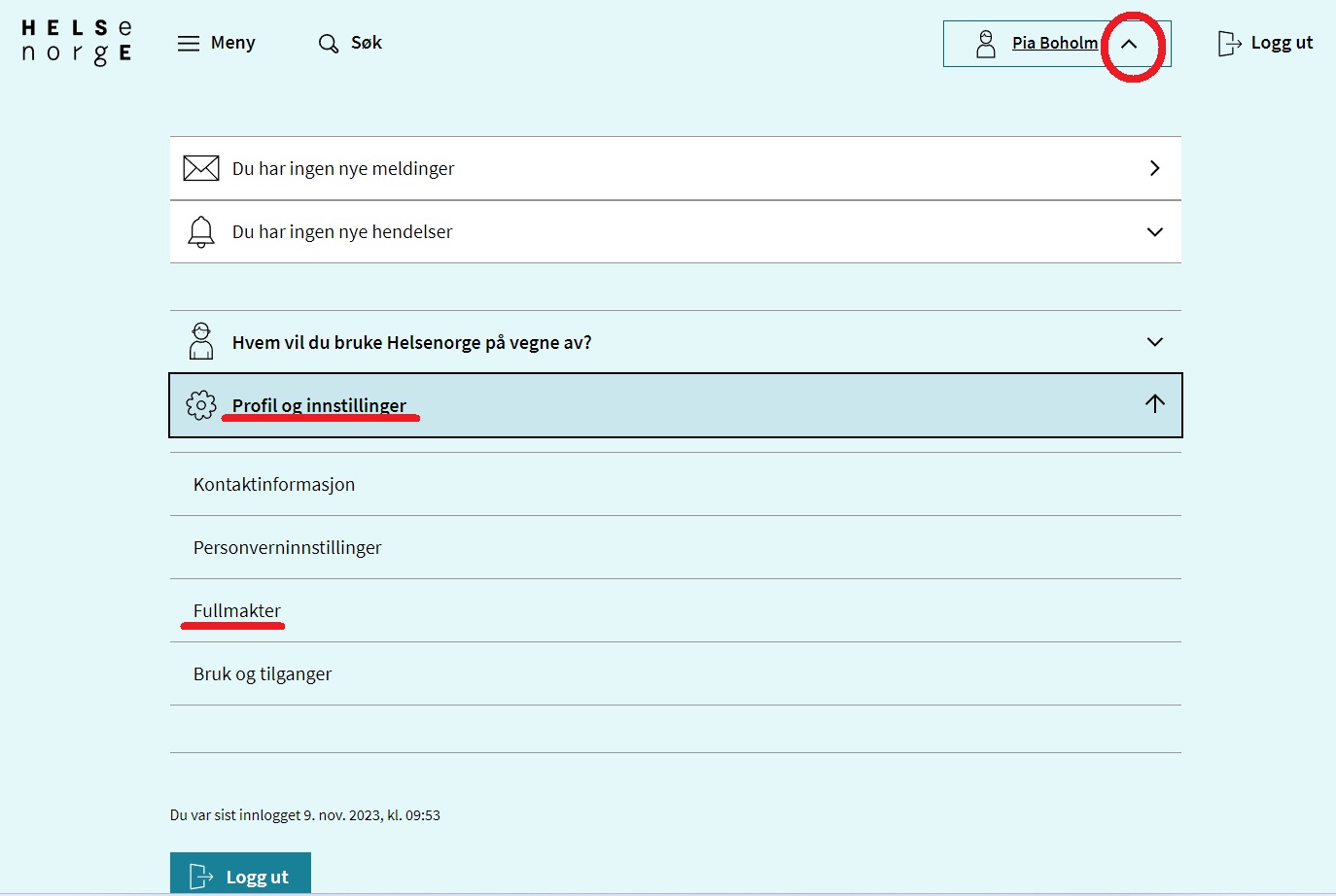 I høyre hjørne på nettsiden finner du profilen din. Trykk på den lille pilen for å få frem en rullegardin-meny. Trykk videre på Profil og innstillinger og til slutt på Fullmakter.