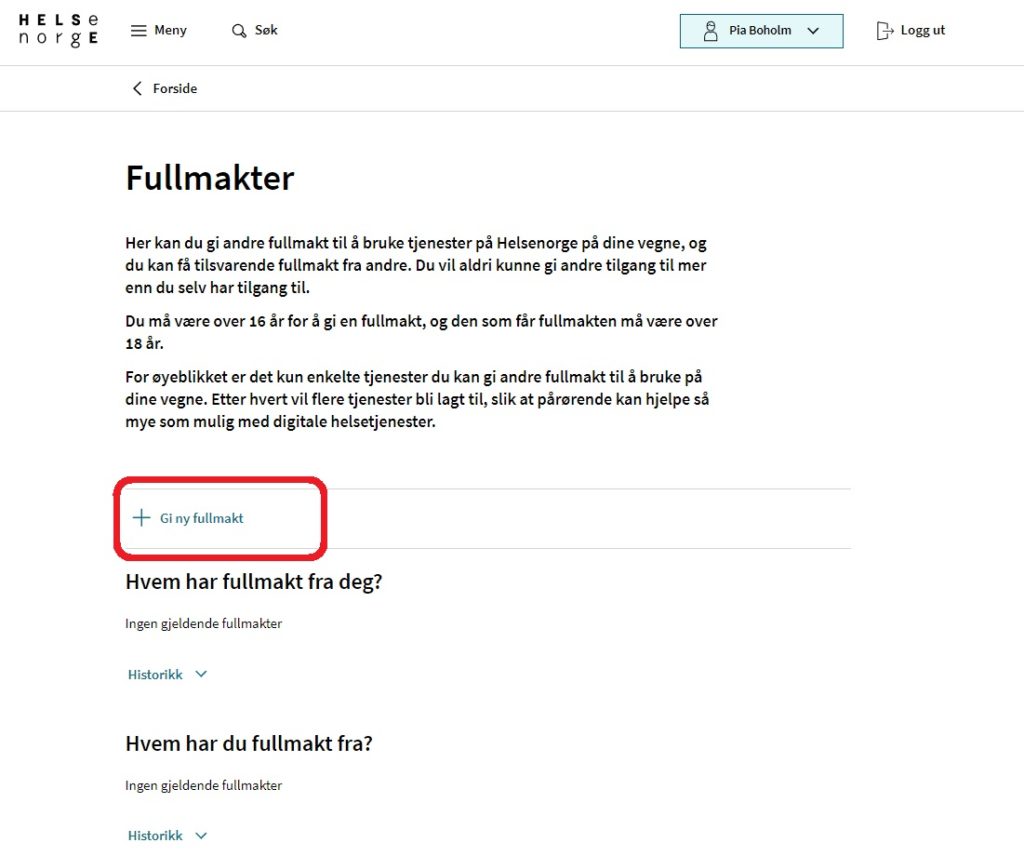 Fullmakten inkluderer kun tjenestene i Helsenorge.