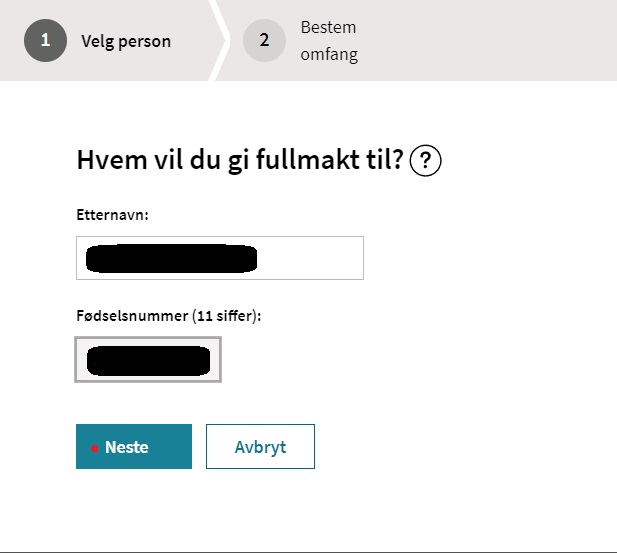I neste steg må du fylle ut informasjon om hvem du gir fullmakt til. Skriv inn etternavn og fødselsnummer før du trykker på neste.