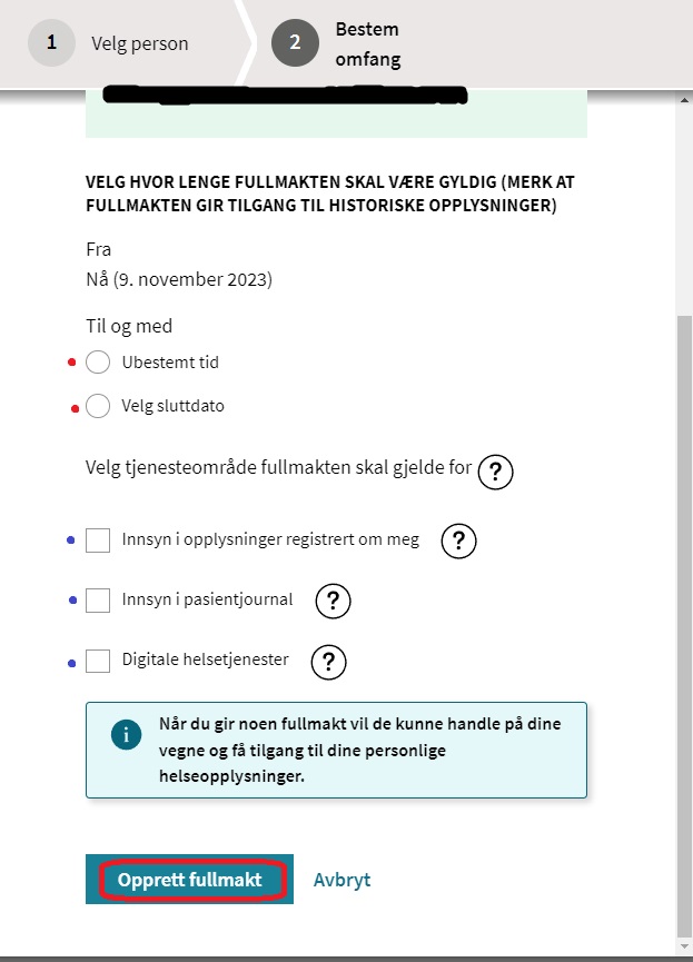 Først må du ta stilling til om fullmakten skal gjelde for en periode eller ubestemt tid og deretter hvilke tjenester fullmakten skal gjelde for.