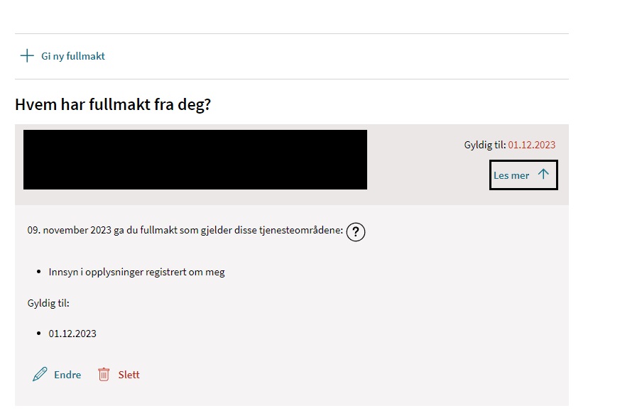 I eksemplet under kan du se at jeg har gitt fullmakt som har en gyldighet til 1.desember. Her har jeg også enkel tilgang til å endre eller slette fullmakten.