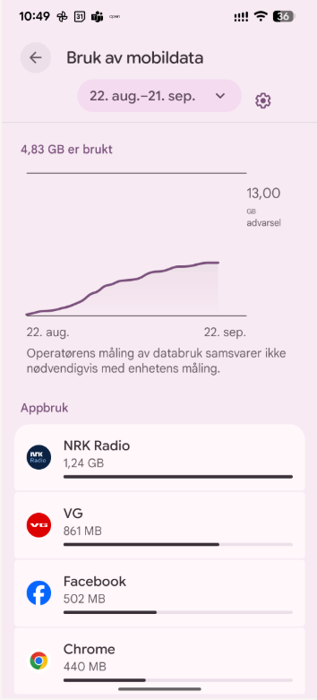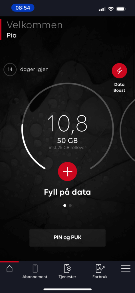 Fra Phonero ser det slikt ut. Her er det brukt 10,8 GB mobildata i innværende faktureringsperiode.