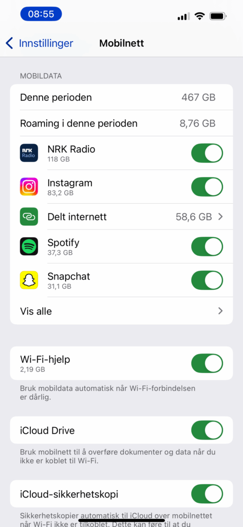 - Mobildata: Datamengden du bruker via mobilnettet når du ikke er koblet til wi-fi.