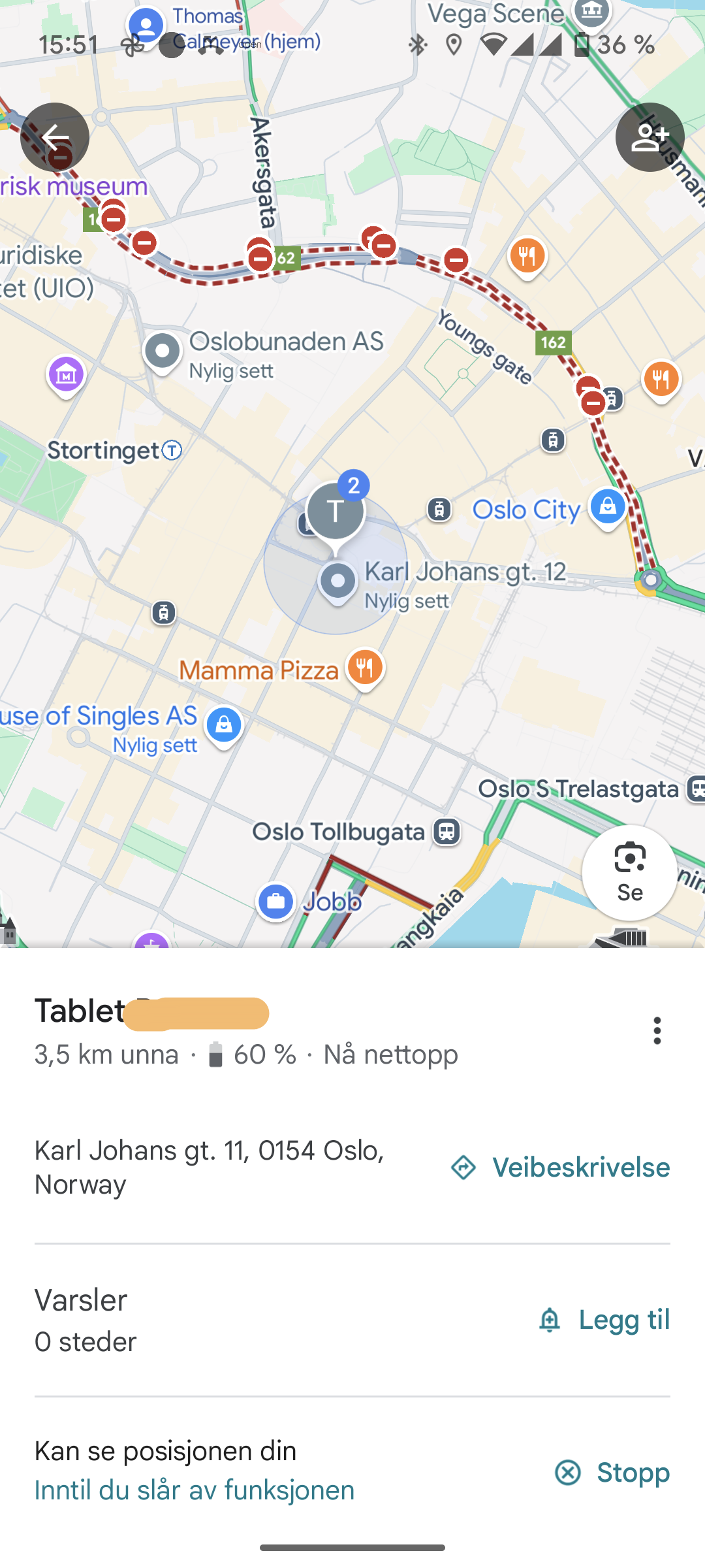 Sirkelen rundt T-en viser at Google Maps ikke er helt sikker på akkurat hvor hun befinner seg. Men hun befinner seg innenfor sirkelen.