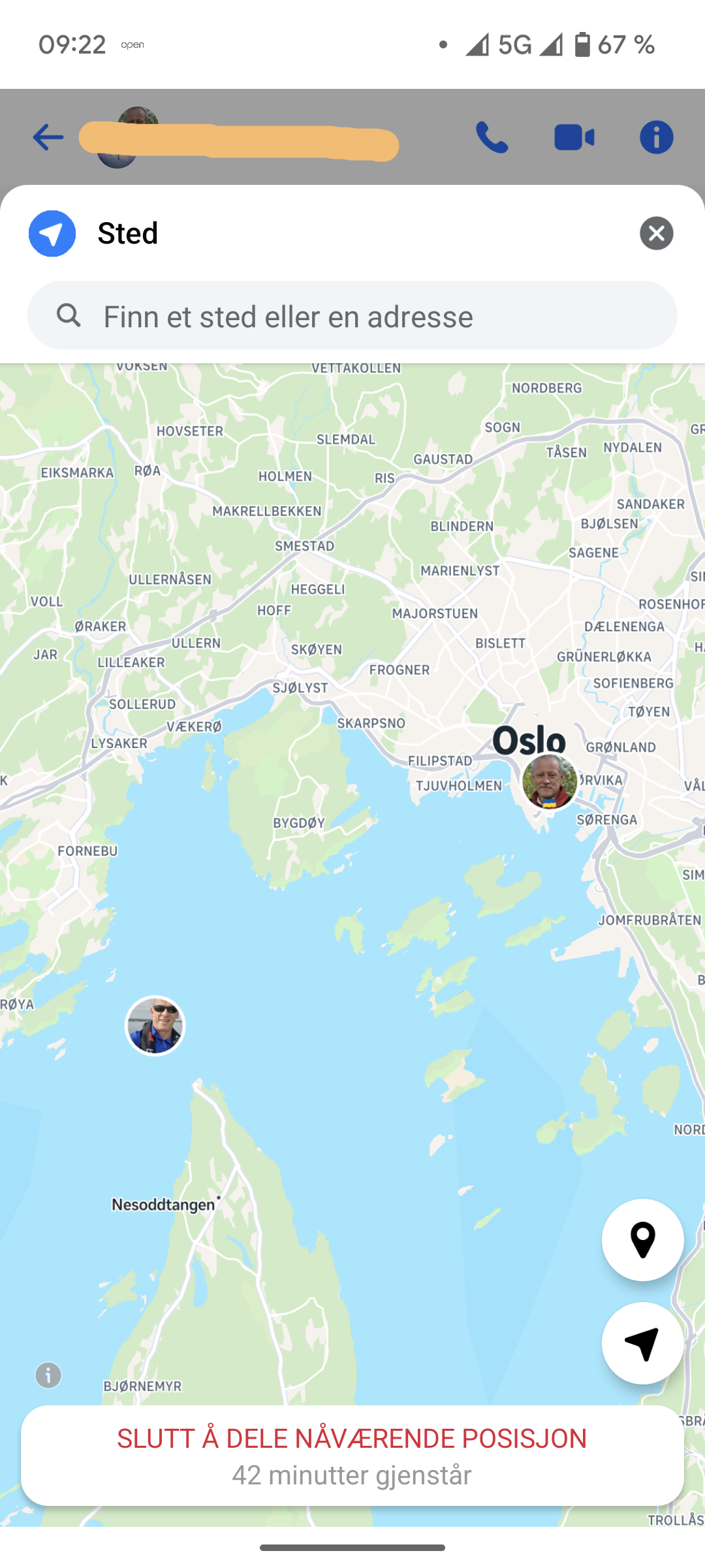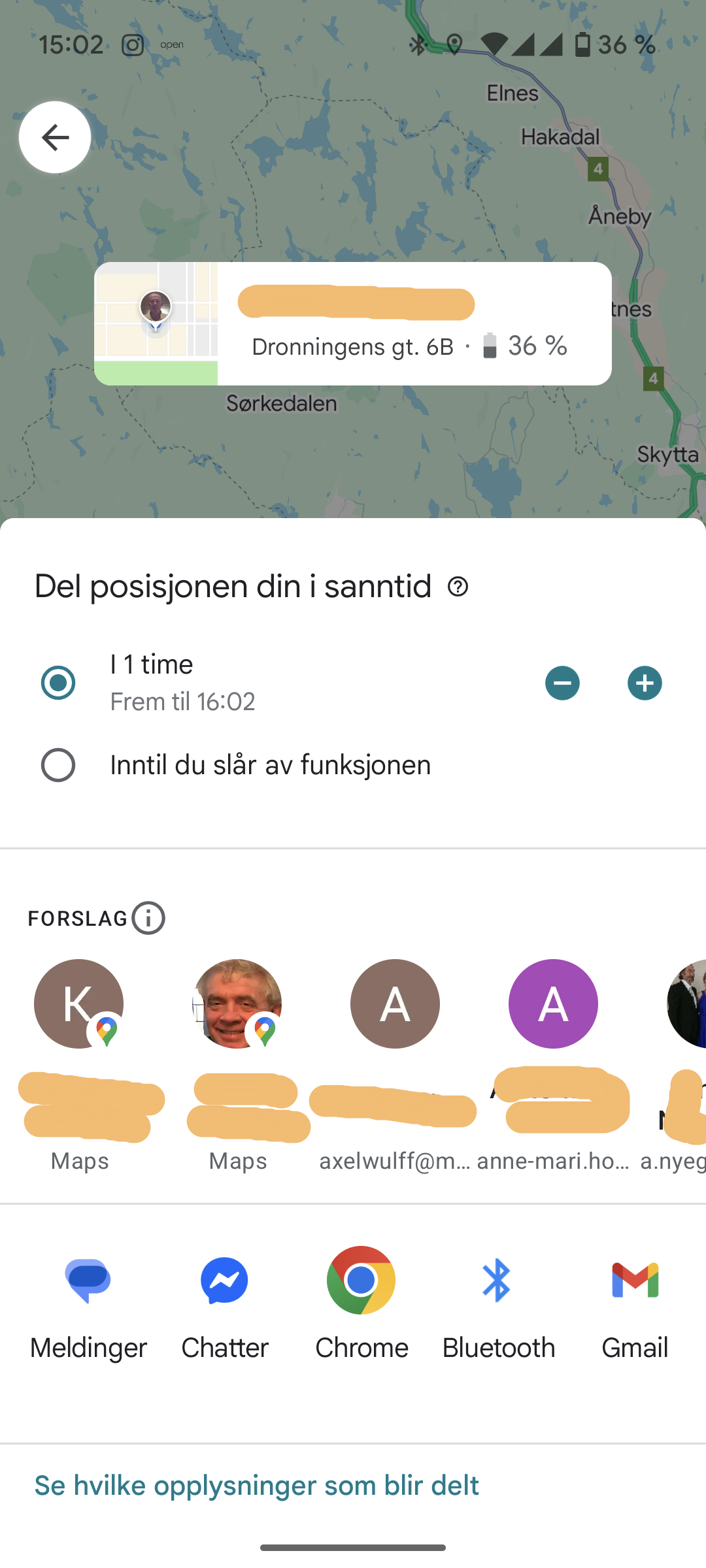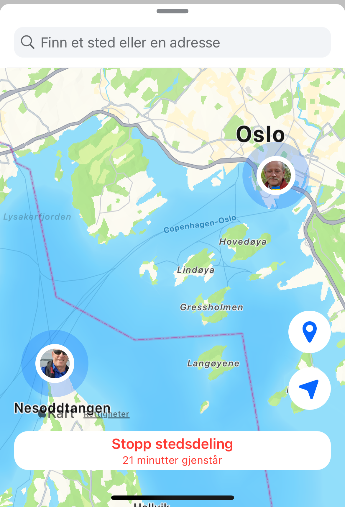 Som du ser kan du når som helst stoppe deling av din posisjon (trykk på «Stopp stedsdeling») og etter 1 time så stopper delingen automatisk