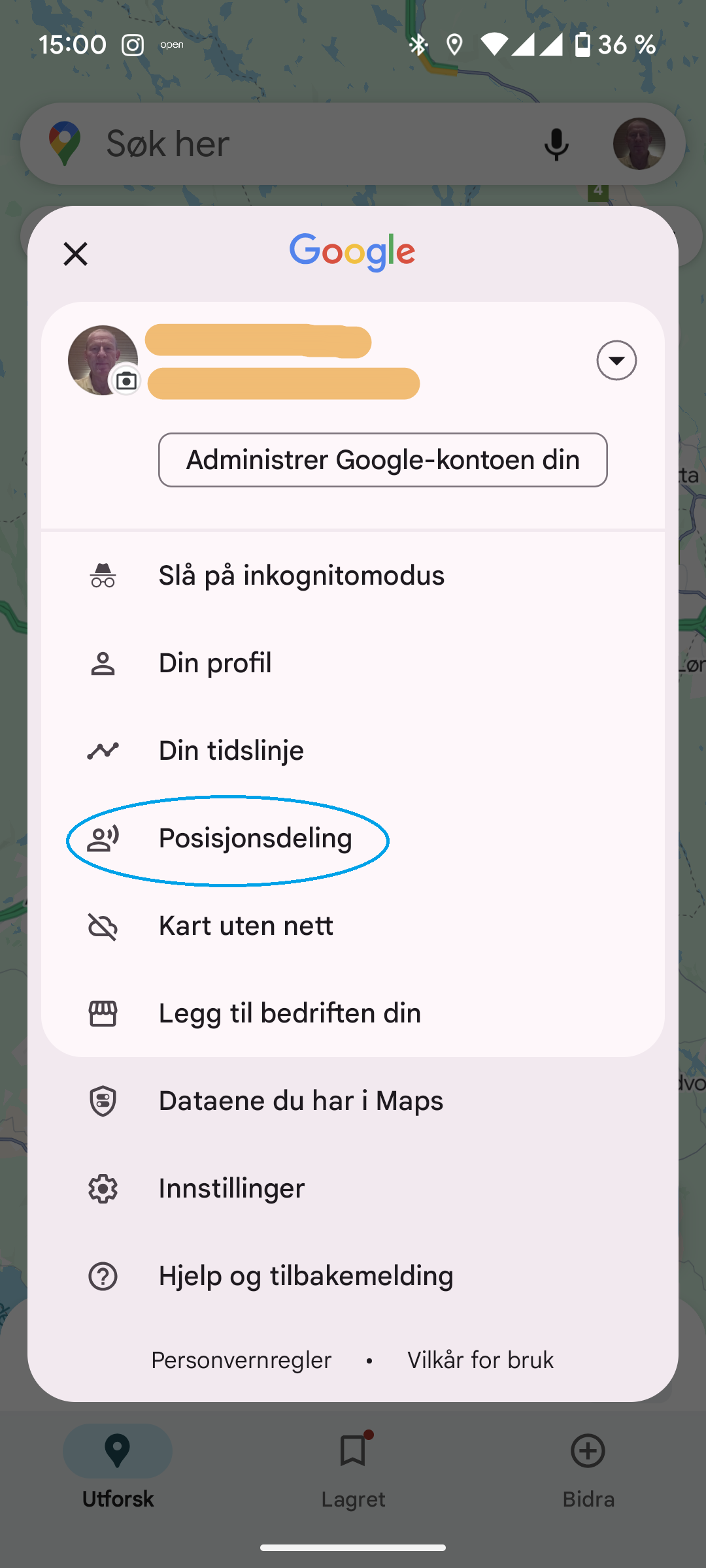Når du vil dele din posisjon, trykk på det runde bildet ditt øverst til høyre (for noen står det bare en bokstav og ikke bilde av deg selv). Da vises dette: