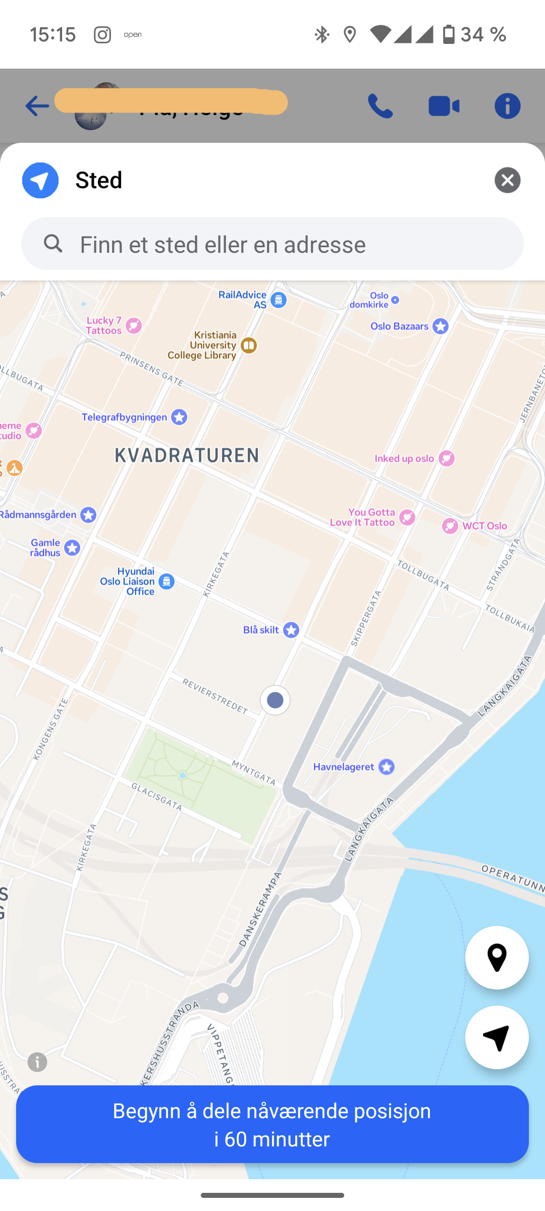 Hvis du allerede deler din posisjon med noen vil du se det på det bildet som da vises. Du kan starte en ny deling ved å trykke på «Ny deling».