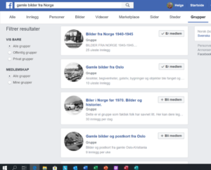 Her har jeg valgt «Gamle bilder fra Norge» og trykket på grupper, diverse grupper dukker opp. Ingen som traff helt, men mange forslag allikevel. Hvis du ikke finner ditt sted, så kan du velge ett sted i nærheten eller en by eller et fylke.