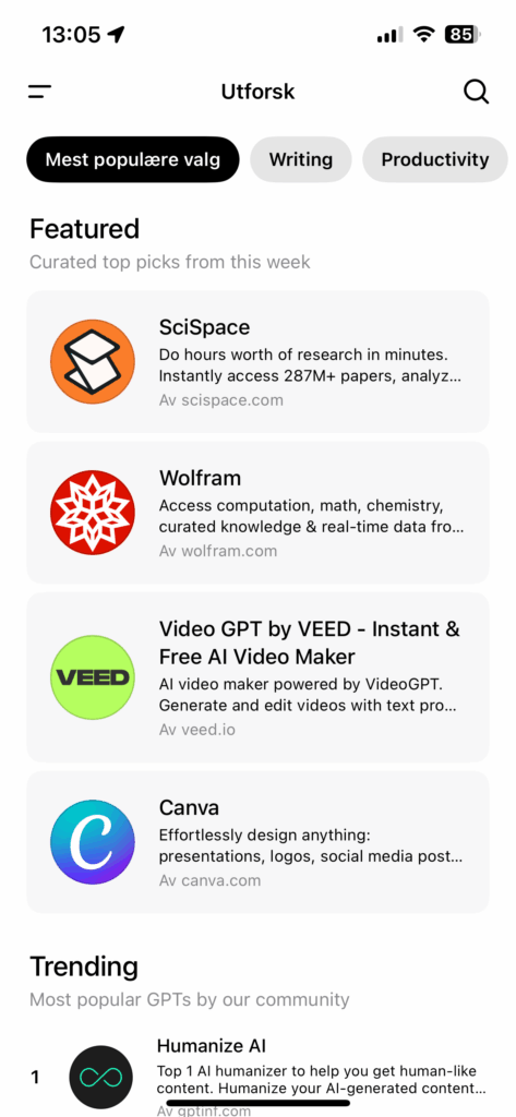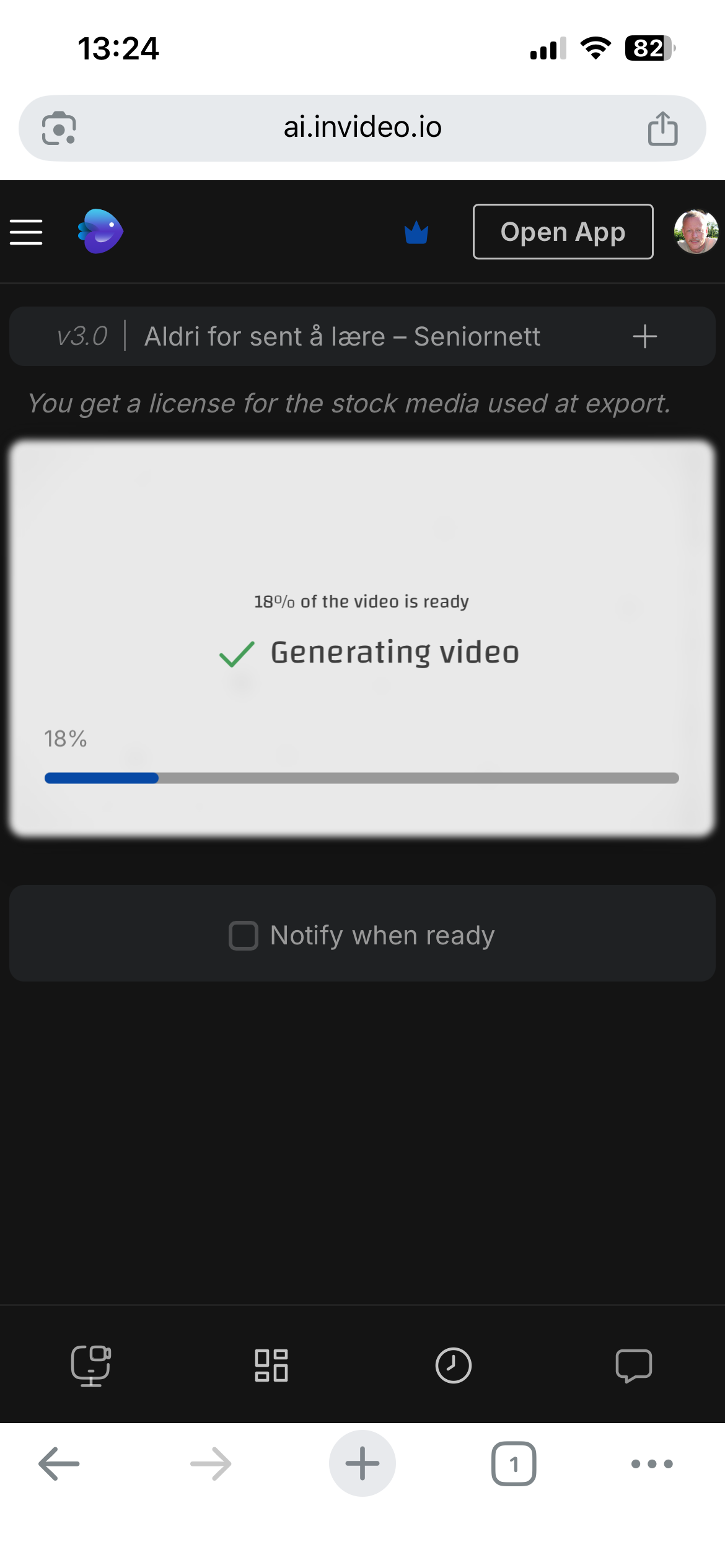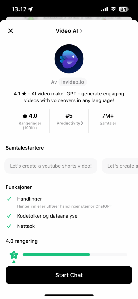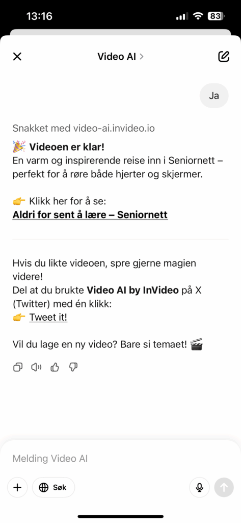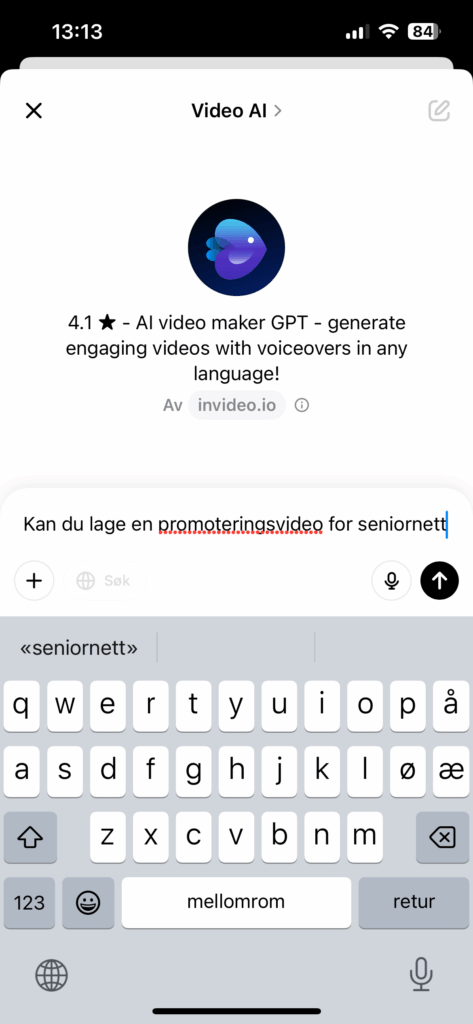 Mange er kjent med ChatGPT-appen og den skal vi bruke i eksempelet her. Det fine med ChatGPT-appen er at den har mange tillegg, veed.io og invideo.io er eksempler på det og de har også en nettside der du kan lage videoer. Dette går veldig kjapt og kvaliteten på videoen blir overraskende bra. Vi får denne videoen også med norsk tale og undertekster.