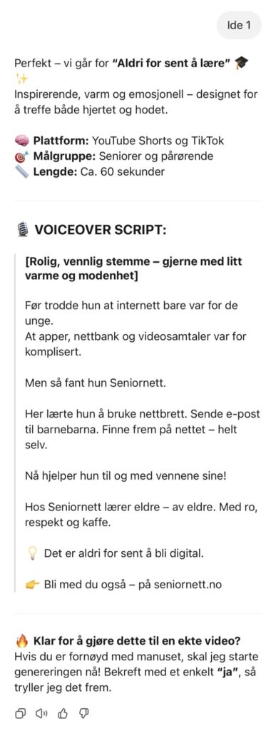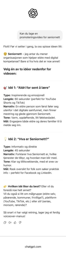 Her ser du at ChatGPT ikke er helt fornøyd med vår prompt. Den er altfor enkel. Den tar utgangspunkt i det promptet vi skrev og utvidet det kraftig. Det munner ut i to ulike forslag til videoer og vi velger den første idéen. Dialogen vi har kan du se i bildene over og under her.