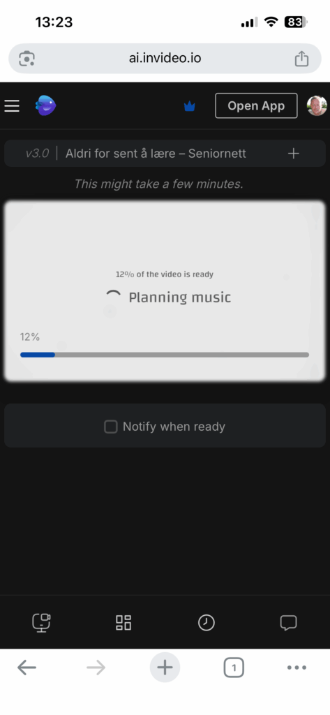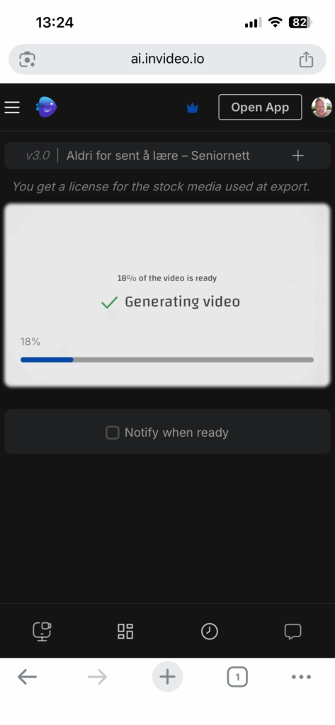 Siden vi ikke hadde lastet ned appen valgte vi å gå til PC-en og inn på nettsiden. Der må du logge deg inn med samme bruker som i ChatGPT. Når du er innlogget får du tilgang til den ferdige videoen.