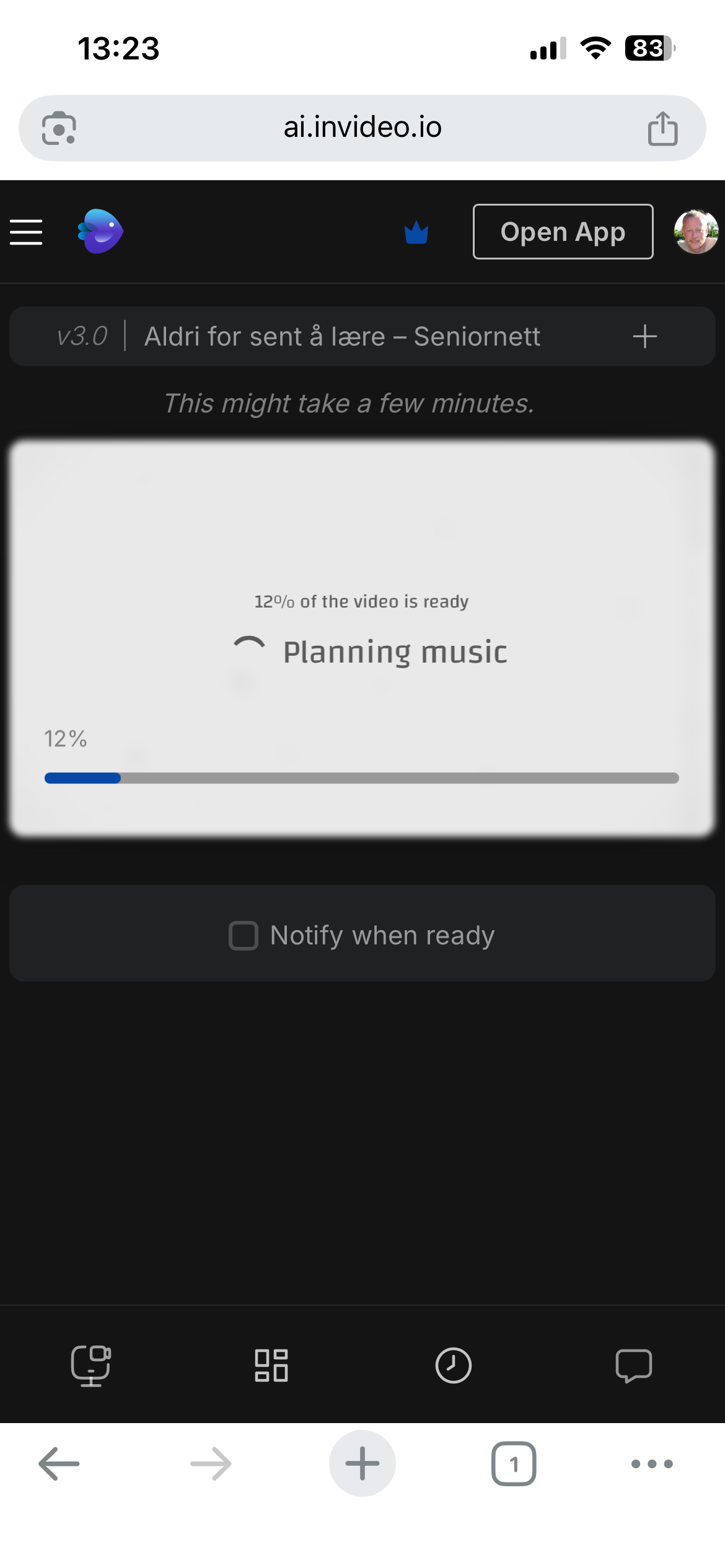 Velg filmen din og klikk på for å se, da dukker vinduet under opp. Det er nettsiden, hvis du ikke har lastet ned appen. Videoen blir da generert, det tar litt tid.