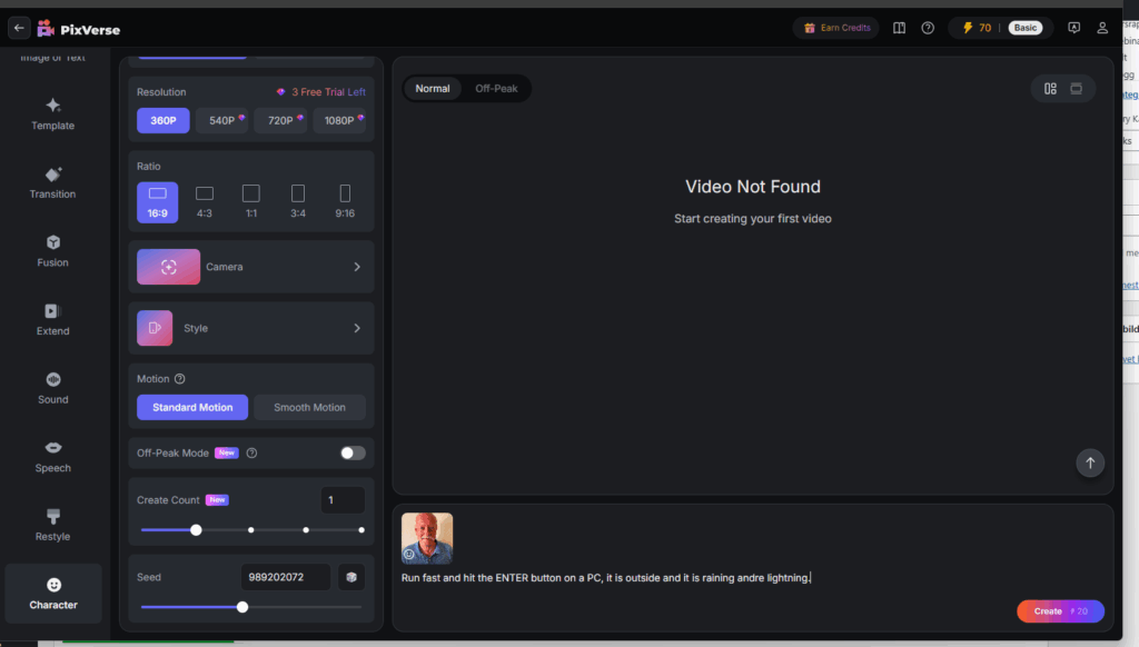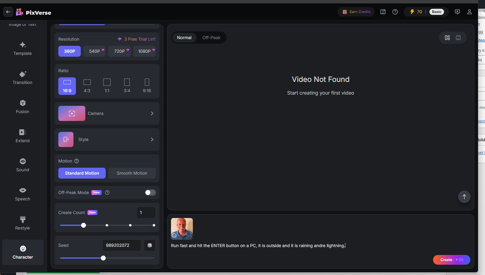 Her har vi valgt lav oppløsning og i tillegg lagt inn et bilde av artikkelforfatter som brukes i videoen. Det gjør du under valget Character. Kommandoen(prompten) som ble gitt var «Run fast and hit the ENTER button on a PC, it is outside and it is raining and lightning».