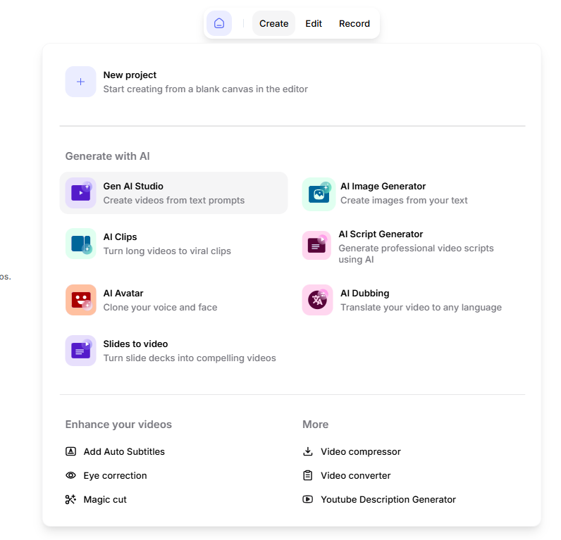 Vi skal nå se på hvordan du kan lage en video med Veed.io. Det kan du gjøre i ChatGPT-appen eller direkte på nettsiden fra en PC eller Mac. Når du åpner nettsiden og logger deg inn får du et åpningsbilde der du kan klikke på «Create» og du får valgene under opp. Der trykker du på «Gen AI Studio» og du kan skrive inn promptet du ønsker. Denne appen lar deg lage noen få videoer gratis, deretter må du betale et abonnement. Det er selve promptet som er den vanskelige jobben. Jo mer detaljert du beskriver handlingen i videoen, jo nærmere det du ønsker å lage får du.