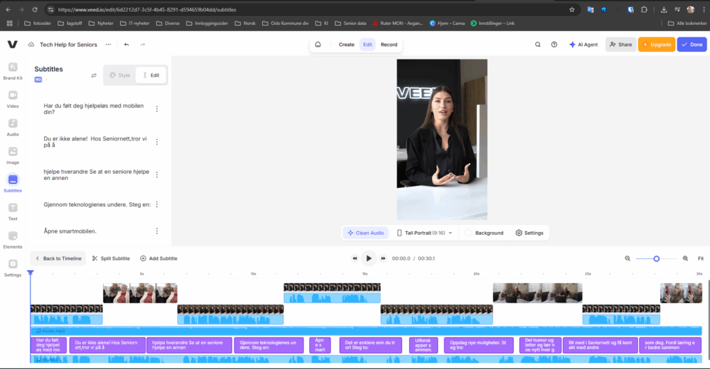 Når du får beskjed om at videoen er ferdig kan du trykke på «Edit» og da er det utrolig mange muligheter til redigering. Du får tidslinjen med lyd, klipp og undertekster. Hvis tekstene er feil kan du redigere de. Du kan klikke på ikonene helt til venstre for å gjøre endringer på deler av videoen. Når du er fornøyd etter å ha sett gjennom kan du trykke på «Done» og du er klar til å laste ned den ferdige videoen.