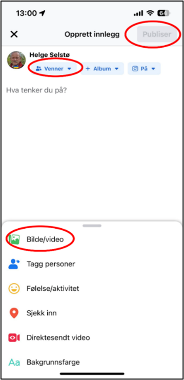 - Bilder og videoer får du lagt til på Facebook ved å klikke på knappen der det står «Bilde/video». (Rød oval)