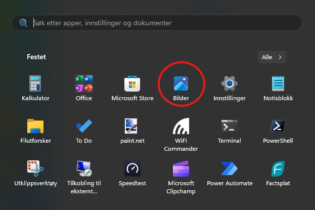 I denne artikkelen skal vi se på hvordan du kan gjøre dette enkelt og kjapt. Vi bruker programmet Bilder som finnes på alle Windows 11 maskiner. Bruken av programmet ser vi på steg for steg. Hvis du klikker på startknappen får du opp de programmene du har festet der. Bilder er markert med rød sirkel.