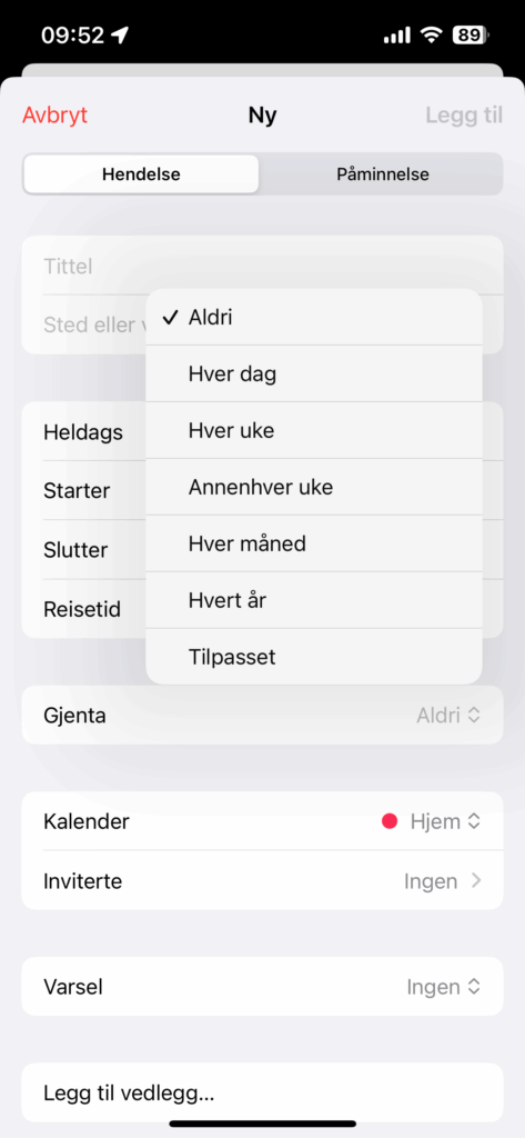 - Klikk på «Gjentas ikke» og du får opp en meny der du velger gjentagelsen du ønsker.