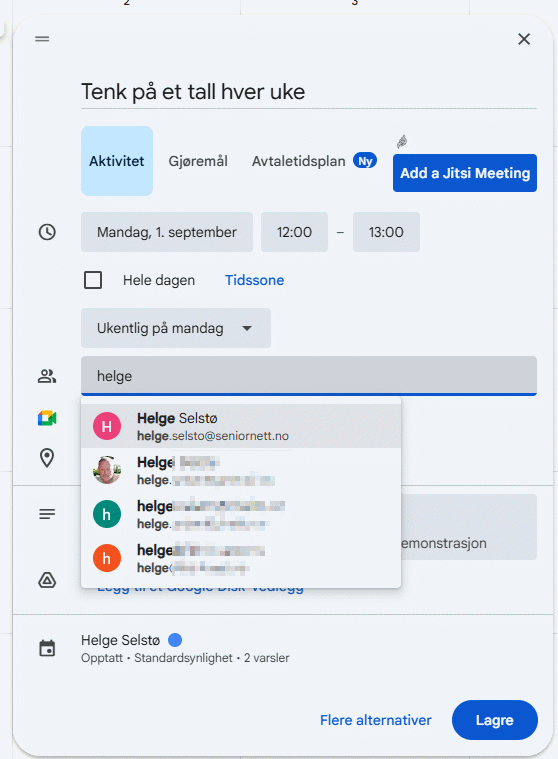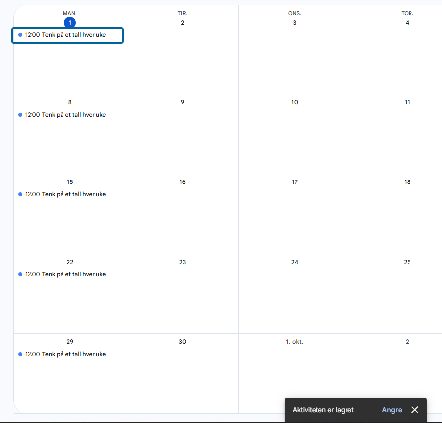 - Hvis alt ser bra ut, klikk på lagre og avtalen ligger i kalenderen med de gjentagelsene du har valgt.