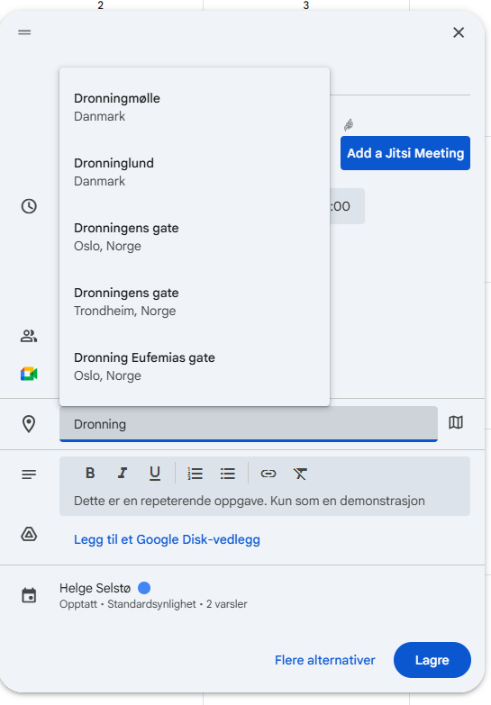 Du kan også lagre adressen for møtet, trykk på «Legg til sted». Bildet under viser hvordan Google slår opp i adresser. Når du finner den riktige kan du klikke på den.