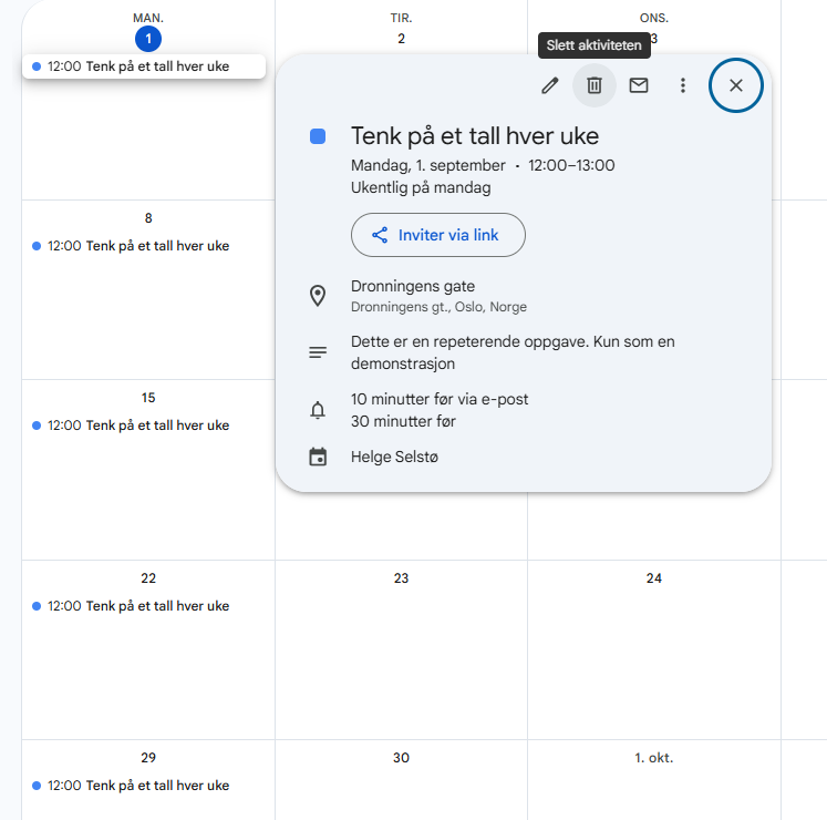 Hvis du ønsker å slette en gjentagende avtale starter du med å klikke på den, da kommer vinduet under opp. Trykk på ikonet av en «søppelbøtte» og slett avtalen.