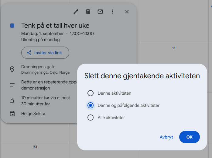 Når du sletter en gjentagende avtale spør Google deg om du vil slette Denne aktiviteten, Denne og påfølgende aktiviteter eller Alle aktiviteter. Du velger det som passer for deg og trykker OK.