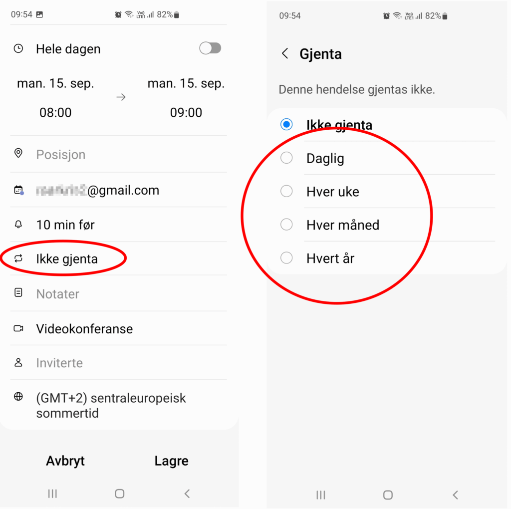 På Android lager du hendelsen på vanlig vis og trykker på Gjenta. Deretter velger du hvor ofte hendelsen skal gjentas. Se bildet under.