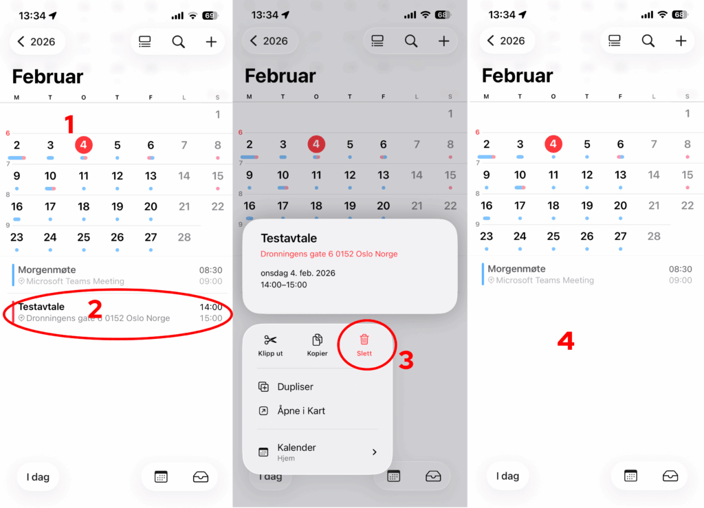For å slette en avtale se bildet over og følg trinnene under. Hvis avtalen var en invitasjon kan den ikke slettes men du kan avslå den.