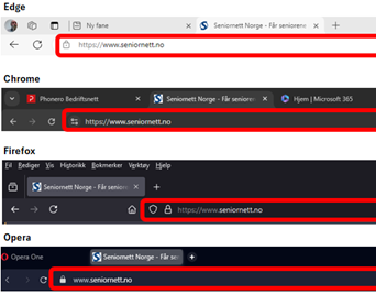 På bildet nedenfor er adressefeltet i forskjellige nettlesere markert med rødt.