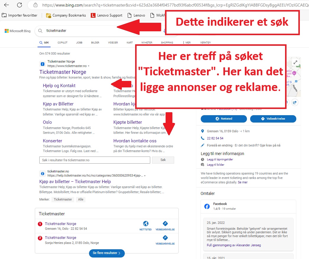 Søk «ticketmaster» i adressefeltet vil resultere i dette: