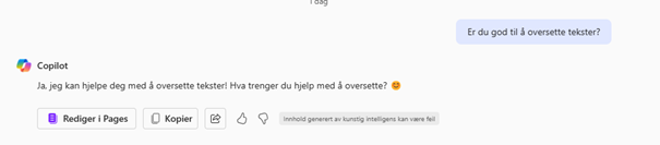 Hvis vi tester med Copilot og spør om Copilot er god til å oversette, får vi dette resultatet:
