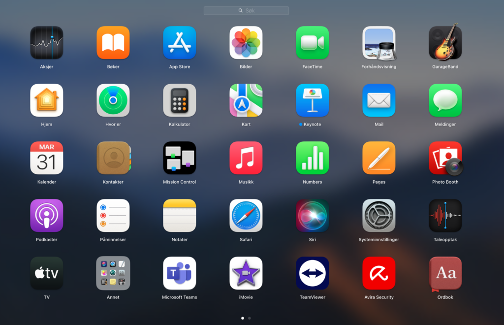 På bildene under ser du eksempler på hva innholdet i Launchpad kan være. Her finner du alle appene du har installert på Mac-en din. Hvis du vil starte en app er det bare å klikke på den. Du kan også søke etter appen din i søkefeltet øverst. Hvis du må navigere til neste side i Lauchpad kan du sveipe til høyre eller venstre på styreflaten eller trykke Kommando-venstrepil eller Kommando-høyrepil.