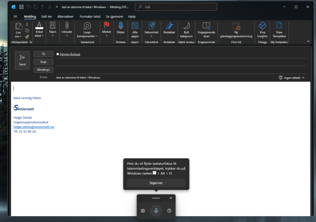 I bildet under ser du hvordan du starter taleinntasting i en e-post. Pass på at markøren står i skrivefeltet, trykk Win + H og start å lese inn e-posten din. Dersom sirkelen rundt mikrofonikonet ikke er blå, trykk på den og mikrofonen blir aktiv. Du vil innimellom også få noen meldinger over mikrofonikonet. Dette er nyttige råd og litt hjelp.