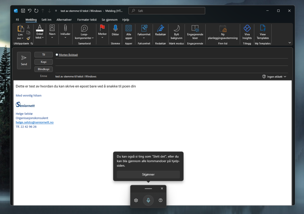 Dette er nesten magisk. Du trenger bare å trykke ned to taster, Win + H, du ser det markert i bildet under. Deretter kan du, hvis du hadde markøren din plassert i et tekstfelt, et e-postprogram eller en tekstbehandler (Word) lese inn teksten du vil skrive. Du kommer til å bli forbauset over hvor bra dette fungerer. Taleinntasting støtter mange språk, men foreløpig ikke nynorsk eller samisk. Taleinntasting støttes av Windows 11. Hvis du har Windows 10, har du dette bare delvis. Der har du talegjenkjenning og du må delvis bruke engelske kommandoer.