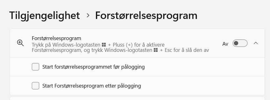 Forstørrelsesverktøyet er en funksjon som hjelper deg med å se noen elementer på skjermen tydeligere. Dette verktøyet er spesielt nyttig for personer med nedsatt syn, men kan også være praktisk for alle som ønsker å forstørre deler av skjermen for bedre lesbarhet eller detaljer. Alt som vises i forstørrelsesvinduet blir forstørret (ikke bare tekst men også kommandoer, bilder og ikoner).