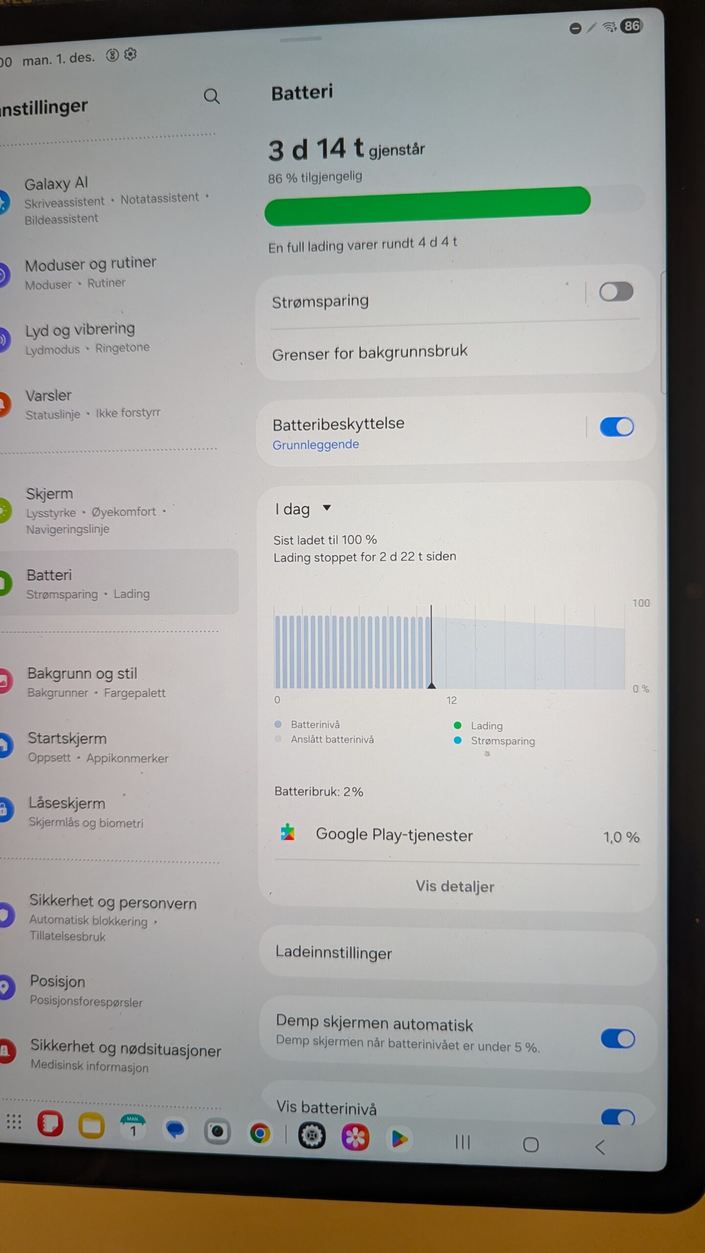 Samsung: På denne telefonen kan du velge å lade kun til 85% for å forlenge levetiden til batteriet ved å velge «Beskytt batteriet»